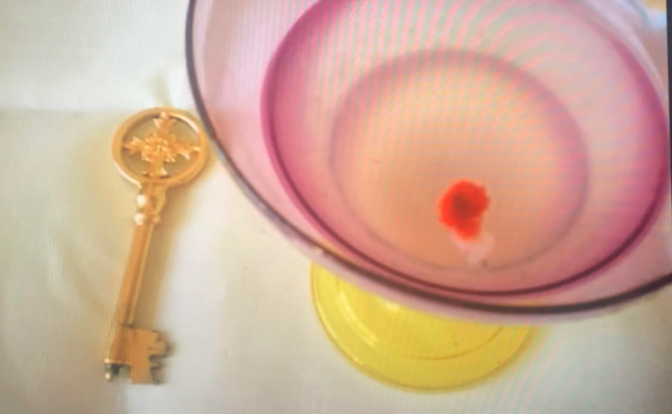 A few days later, on October 19, when the pastor asked her about the condition of the host, the sacristan Sister Julia went to the safe. When she opened the door, delicate aroma of unleavened bread came from the tabernacle. When she opened the container, she saw, in the middle of the host — which was still largely intact — a curved, bright red stain, like a blood stain: a living particle of a body. The water was untainted by the color.
